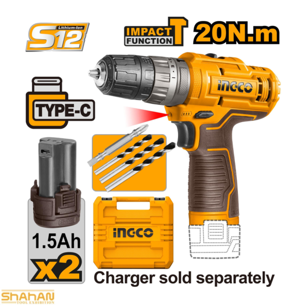 دریل شارژی 12 ولت چکشی 2 باتری اینکو مدل CIDLI12206