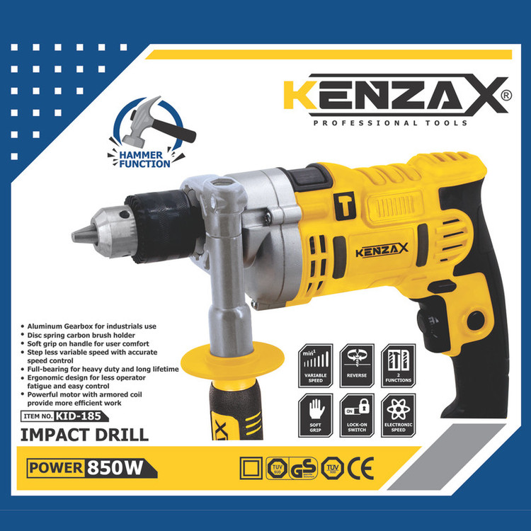 محصول فوق یکی دیگر ازمحصولات برقی تولیدی شرکت «کنزاکس» (Kenzax) میباشد. امروزه برای سوراخ کردن اجسام مختلف، از انواع دریلهای برقی یا شارژی استفاده میکنند. کار با این دستگاه کار چندان مشکلی نیست و نیاز به کسب مهارت خاصی ندارد. با توجه به میل افراد جامعه به انجام کارهای فنی در منزل، در بسیاری از خانهها نمونهای از این دستگاه دیده میشود. دریلها انواع مختلفی دارند و انرژی موردنیاز خود را از برق یا باتری میگیرند. با استفاده از دریلهای معمولی قادر به سوراخ کردن اجسامی از جنس چوب، پلاستیک یا فلزات می باشید. اما با این دریل که قابلیت سوراخ کاری در حالت چکشی را داراست علاوه بر این موارد، دیوار، سرامیک و انواع مصالح ساختمانی را میتوانید سوراخ کنید. دریل چکشی کنزاکس ابزاری مناسب برای سوراخکاری در انواع سطوح چوبی و فلزی و مصالح ساختمانی می باشد. این دریل چکشی حدود 2100 گرم وزن دارد و در ابعاد کوچک 28 × 20 × 7 سانتیمترتولید شده است . با توجه با استفاده از سه نظام فلزی مارک پیکاک حداکثر قطر سوراخکاری آن در دیوار 13 میلیمتر, چوب 25 میلیمترو در فلز 10 میلیمتراست. این دستگاه از سیستم گردشی راستگرد و چپ گرد بهره میبرد. و حالت سوراخ کاری معمولی و ضربهای را برای شما فراهم میسازد. منبع تغذیهی این دریل، برق شهری است و با ولتاژ ورودی 220 ولت کار میکند. توان خروجی این ابزار 850 وات است و میتواند با سرعت گردش صفر تا حداکثر 3100 دور در دقیقه به سوراخکاری بپردازد. برای سهولت در سوراخکاری، دستهای کمکی از جنس آلومینیوم با تزریق دو رنگ و روکش TPR ضد تعریق با قابلیت چرخش 360 درجه در قسمت جلویی دستگاه قرار دارد و از یک خط کش فلزی که عمق سوراخ کاری را تنظیم می کند بهره می برد. شرکت کنزاکس که همیشه در تولید ابزار های صنعتی نوآور است این محصول را تحت عنوان مدل «KID-185» به بازار عرضه میکند. لازم به ذکر است این دریل مخصوص کار روی فلزات ، انواع چوبها ، PVC ، مصالح بنایی از قبیل دیوار و بتن و موادی است که فشار معکوس به دریل وارد نمیکنند . خصوصیت بارز این مدل مجهز بودن به گیربکس فلزی با فلنج میانی است که این مدل را در دسته محصولات صنعتی قرار میدهد