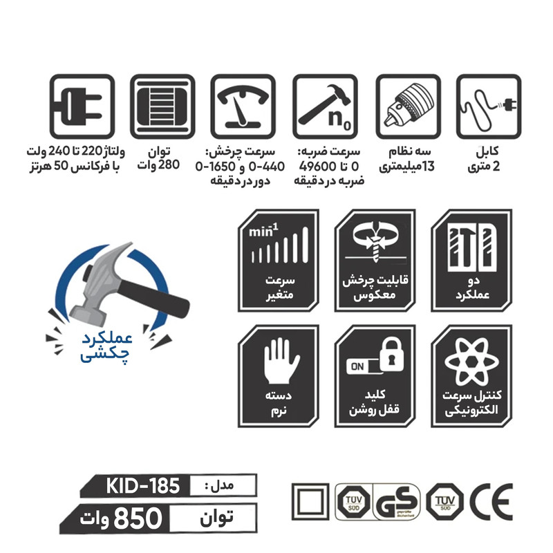 محصول فوق یکی دیگر ازمحصولات برقی تولیدی شرکت «کنزاکس» (Kenzax) میباشد. امروزه برای سوراخ کردن اجسام مختلف، از انواع دریلهای برقی یا شارژی استفاده میکنند. کار با این دستگاه کار چندان مشکلی نیست و نیاز به کسب مهارت خاصی ندارد. با توجه به میل افراد جامعه به انجام کارهای فنی در منزل، در بسیاری از خانهها نمونهای از این دستگاه دیده میشود. دریلها انواع مختلفی دارند و انرژی موردنیاز خود را از برق یا باتری میگیرند. با استفاده از دریلهای معمولی قادر به سوراخ کردن اجسامی از جنس چوب، پلاستیک یا فلزات می باشید. اما با این دریل که قابلیت سوراخ کاری در حالت چکشی را داراست علاوه بر این موارد، دیوار، سرامیک و انواع مصالح ساختمانی را میتوانید سوراخ کنید. دریل چکشی کنزاکس ابزاری مناسب برای سوراخکاری در انواع سطوح چوبی و فلزی و مصالح ساختمانی می باشد. این دریل چکشی حدود 2100 گرم وزن دارد و در ابعاد کوچک 28 × 20 × 7 سانتیمترتولید شده است . با توجه با استفاده از سه نظام فلزی مارک پیکاک حداکثر قطر سوراخکاری آن در دیوار 13 میلیمتر, چوب 25 میلیمترو در فلز 10 میلیمتراست. این دستگاه از سیستم گردشی راستگرد و چپ گرد بهره میبرد. و حالت سوراخ کاری معمولی و ضربهای را برای شما فراهم میسازد. منبع تغذیهی این دریل، برق شهری است و با ولتاژ ورودی 220 ولت کار میکند. توان خروجی این ابزار 850 وات است و میتواند با سرعت گردش صفر تا حداکثر 3100 دور در دقیقه به سوراخکاری بپردازد. برای سهولت در سوراخکاری، دستهای کمکی از جنس آلومینیوم با تزریق دو رنگ و روکش TPR ضد تعریق با قابلیت چرخش 360 درجه در قسمت جلویی دستگاه قرار دارد و از یک خط کش فلزی که عمق سوراخ کاری را تنظیم می کند بهره می برد. شرکت کنزاکس که همیشه در تولید ابزار های صنعتی نوآور است این محصول را تحت عنوان مدل «KID-185» به بازار عرضه میکند. لازم به ذکر است این دریل مخصوص کار روی فلزات ، انواع چوبها ، PVC ، مصالح بنایی از قبیل دیوار و بتن و موادی است که فشار معکوس به دریل وارد نمیکنند . خصوصیت بارز این مدل مجهز بودن به گیربکس فلزی با فلنج میانی است که این مدل را در دسته محصولات صنعتی قرار میدهد