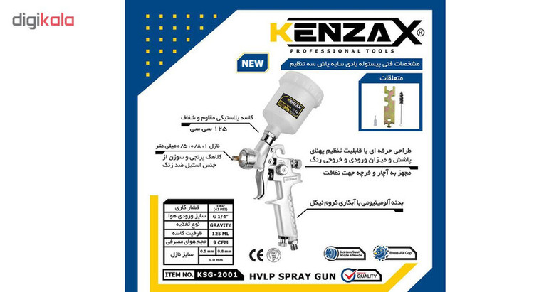 به طور کل، پیستولهها در دو حالت برقی و یا بادی جهت رنگ آمیزی و نقاشی ارائه میشوند. امروزه جهت صرفهجویی دروقت و نیز داشتن رنگ آمیزی یکنواخت، از پیستوله به جای قلم مو جهت رنگ آمیزی استفاده میشود. با استفاده از پیستوله نه تنها رنگ آمیزی سریعتر انجام میشود، بلکه در مصرف انرژی کاربر نیز صرفهجویی میشود. باید درنظر داشت که جهت استفاده از پیستولههای بادی وجود یک منبع باد و یا کمپرسور پیش نیاز است. پیستوله بادی کنزاکس مدل KSG-2001 یکی از پیستولههای پرکاربرد از مجموعه پیستولههای برند کنزاکس میباشد. این پیستوله بادی دارای سه تنظیم میباشد. به پیستوله سایه پاش به دلیل دقت بسیار بالای نقاشی معروف است. بدنه این پیستوله فلزی و کاسه آن پلاستیکی است. مخزن (کاسه) این مدل، حجم مناسبی از رنگ (125 میلی لیتر) را در خود جای میدهد. به علت افزایش دقت و پاشش یکنواخت و نیز افزایش عمر پیستوله، از نازل (دهانه) با جنس برنج در این پیستوله استفاده شده است. KSG-2001 با سه سایز نازل و سوزن ارایه گشته است (سایزهای نازل این محصول میتواند برابر با 0.5 ، 0.8 و یک میلیمتر باشد که کالا در حالت پیش فرض با سوزن 0.5 به بازار ارایه گشته است تا حساسیت و دقت پاشش رنگ به حداکثر برسد. جهت اتصال این پیستوله به شلنگ فنری، باید از یک عدد مهره استفاده نمود. داخل بسته بندی این دستگاه آچار جهت باز و بسته کردن ، فیلتری جهت جلوگیری از ورود ناخالصی رنگ و برس جهت نظافت پس از رنگ آمیزی همچنین دفترچه راهنما به زبان فارسی وجود دارد.