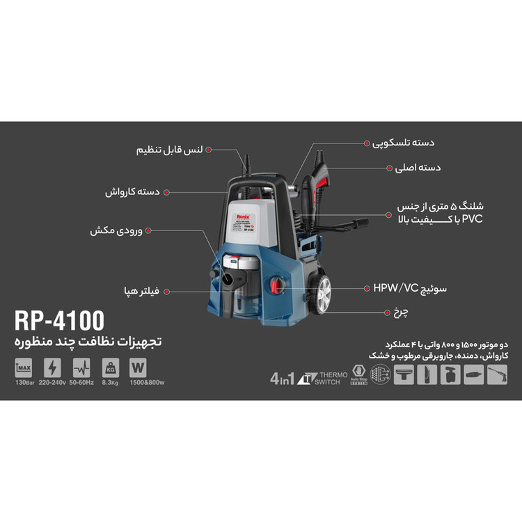 مخزن مواد شوینده ، رابط ورودی آب ، کوپلز اتصال سریع ، 5متر شبنگ فشار قوی ، لانس قابل تنظیم ، برس مبلمان ، سری گوشه گیر ،لوله خرطومی ، گان