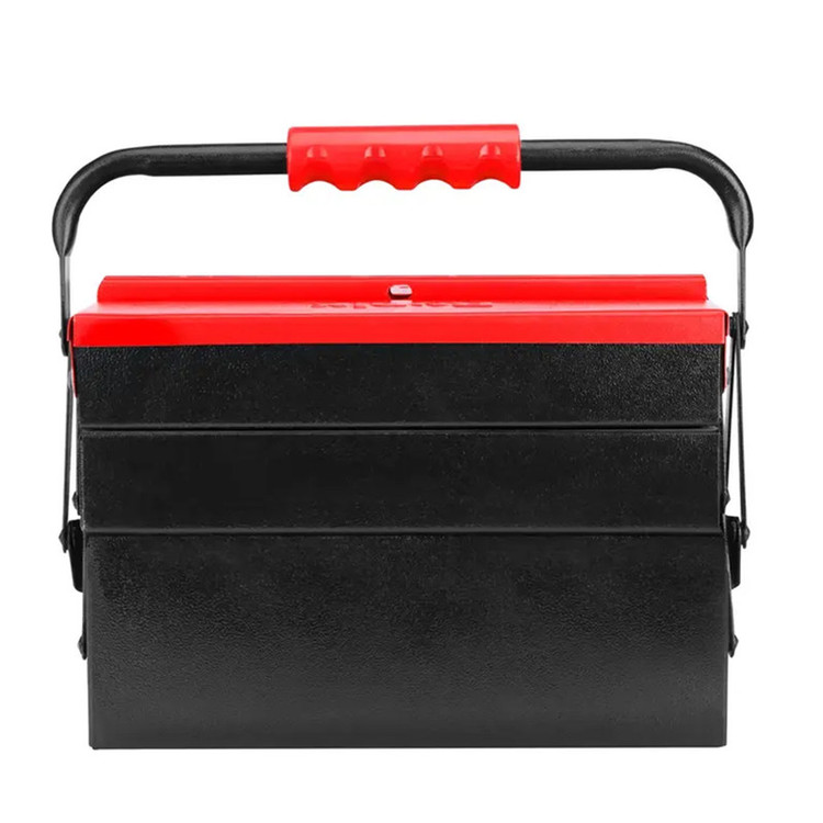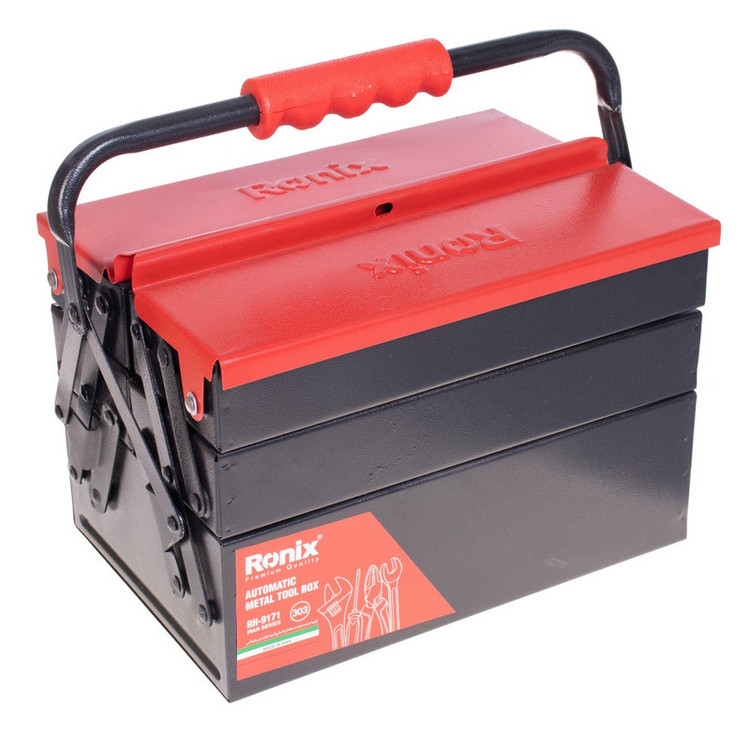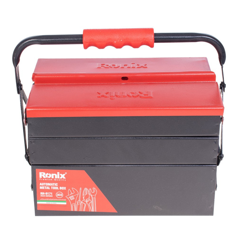 این جعبه ابزار تمام فلزی، از ورقهی فولادی ضد زنگ مرغوب ساخته شده است و تمامی قسمتهای آن به وسیلهی پینهایی بادوام و باکیفیت، به صورت محکم و منظم به هم متصل شده اند تا محل مطمئن و جاداری را برای انواع ابزار شما فراهم کنند. دستهی فلزی این جعبه ابزار رونیکس، در قسمت میانی خود دارای یک دستگیرهی پلاستیکی ABS خوشدست به طول 11.5 سانتیمتر است که به خاطر جنس خوب خود و داشتن جای قرارگیری انگشت، حمل و نقل جعبه را به راحتی و بدون فشار و خستگی دست انجام در پی دارد. روکش بدنهی این جعبه ابزار رونیکس فلزی، رنگ کوره ای الکترواستاتیک است. این روش رنگ کاری ویژه و کاربردی، علاوه بر دوام بدنه، جعبه را ضد خش و خراشیدگی میکند. درب بالایی و اصلی این جعبه ابزار به صورت اتوماتیک است و به شکل کاملا منظم باز و بسته میشود. این جعبه ابزار سه طبقه، مجموعا دارای 5 محفظه یعنی 4 محفظهی کوچکتر با ابعاد 4.5×10×30 سانتیمتر و یک محفظهی بزرگتر با ابعاد 10×20×30 سانتیمتر است. این جعبه ابزار سایز 30 سانتی، در وزن مناسب 3525 گرم و ابعاد21×20.5×30 عرضه شده است.