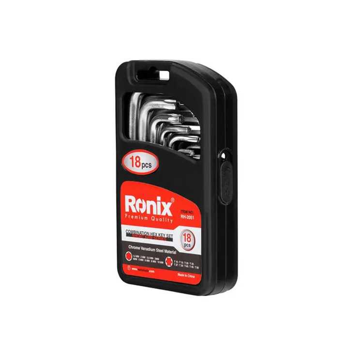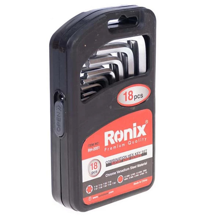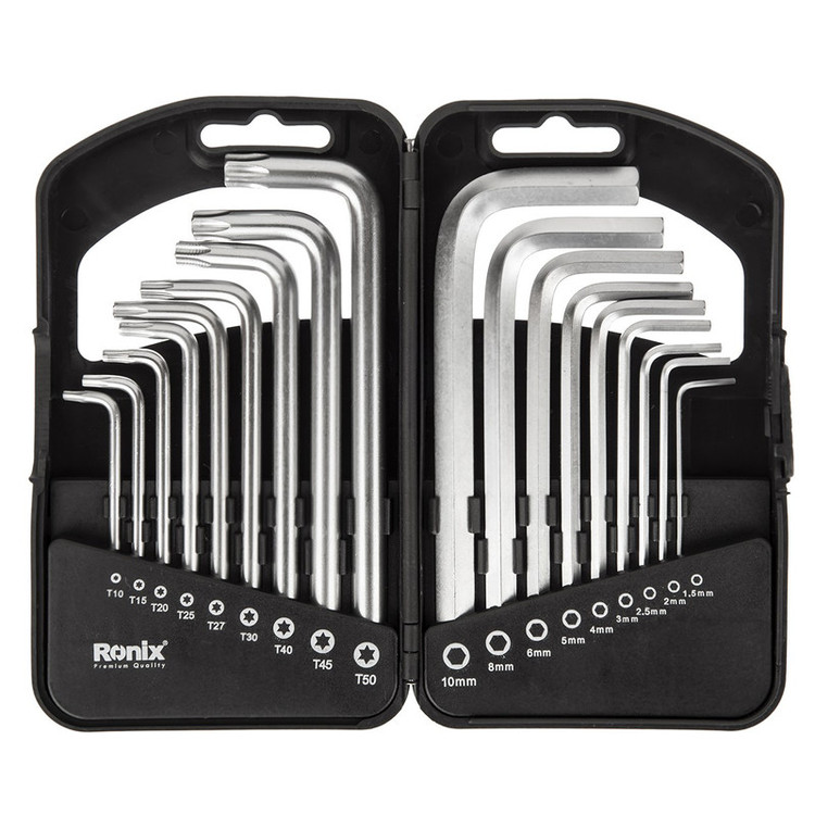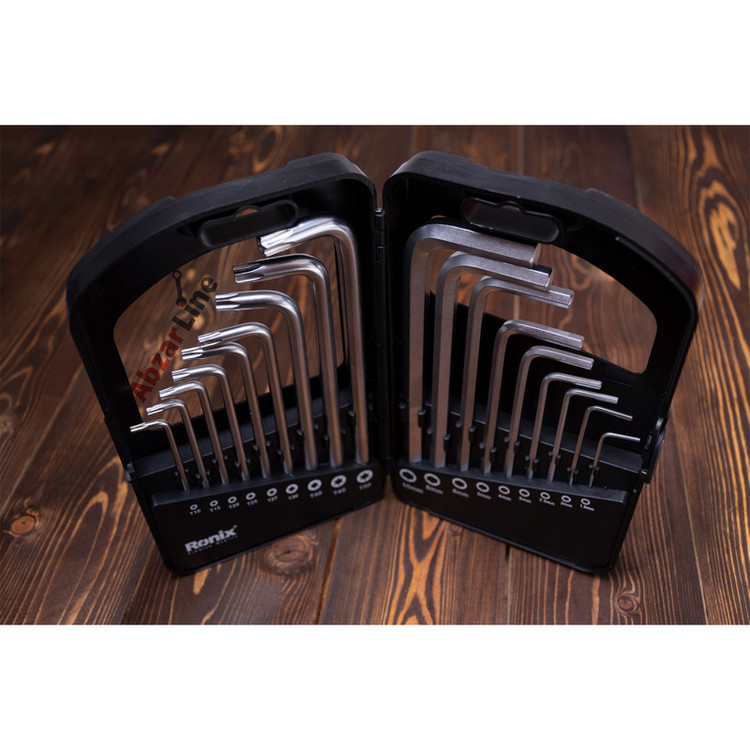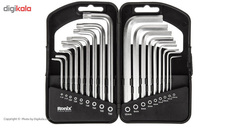 - 9 عدد آچار آلن در سایزهای 1.5، 2، 2.5، 3، 4، 5، 6، 8 و 10 میلیمتر - 9 عدد آچار ستارهای درسایزهای T10، T15، T20، T25، T27، T30، T40، T45 و T50 - قابلیت آویزان کردن قاب نگهدارنده - آچارهای با زاویه 90 درجه