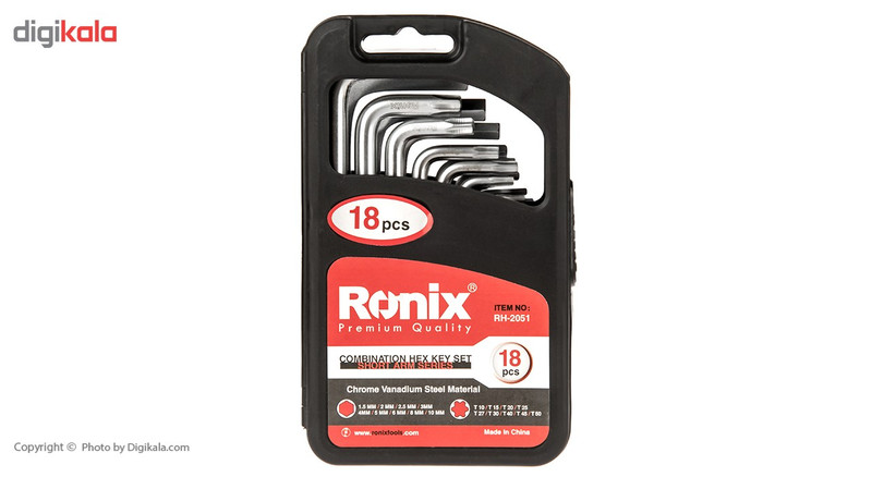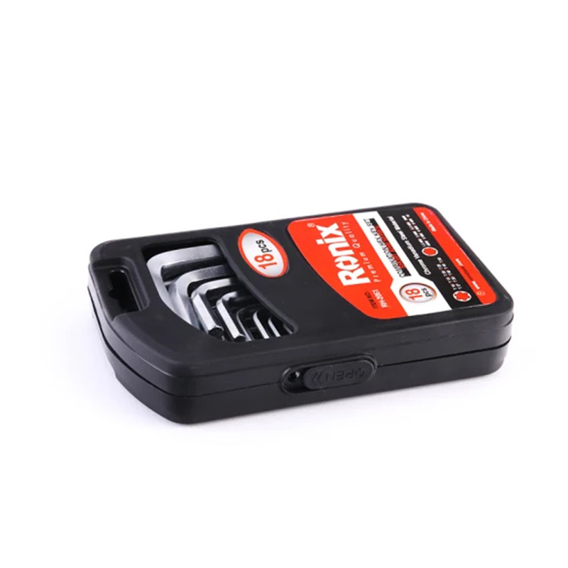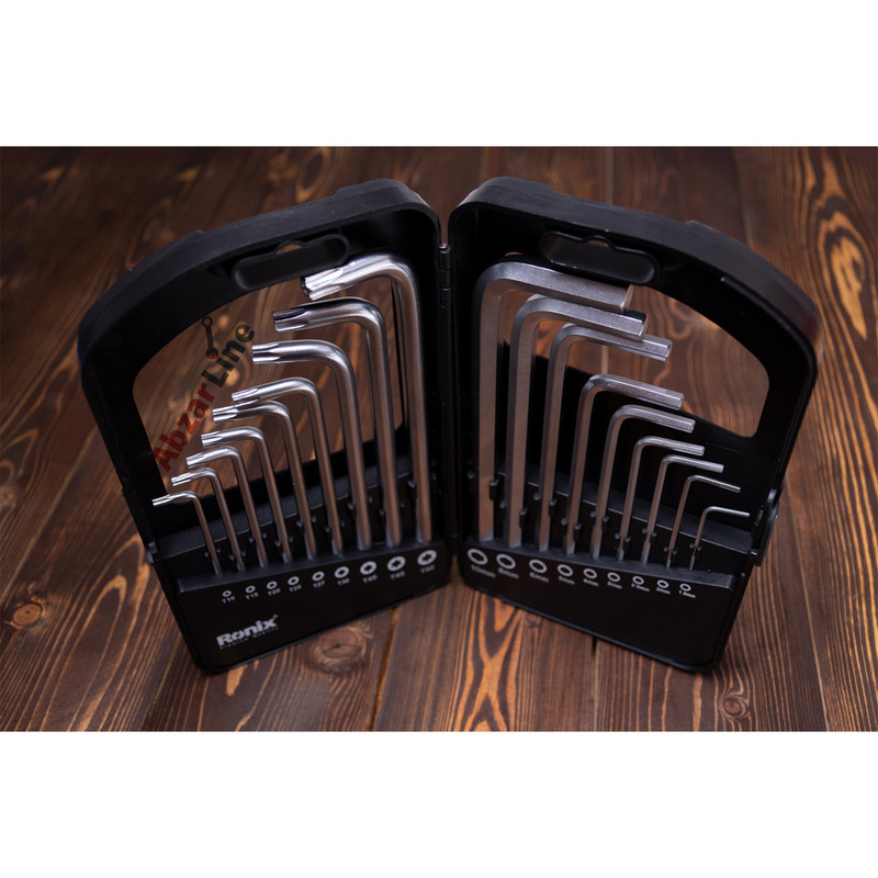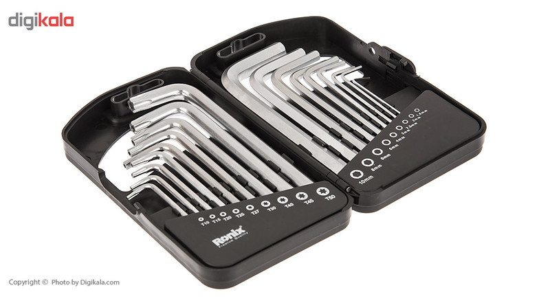 - 9 عدد آچار آلن در سایزهای 1.5، 2، 2.5، 3، 4، 5، 6، 8 و 10 میلیمتر - 9 عدد آچار ستارهای درسایزهای T10، T15، T20، T25، T27، T30، T40، T45 و T50 - قابلیت آویزان کردن قاب نگهدارنده - آچارهای با زاویه 90 درجه