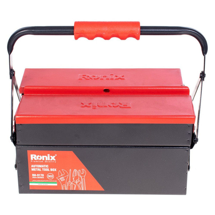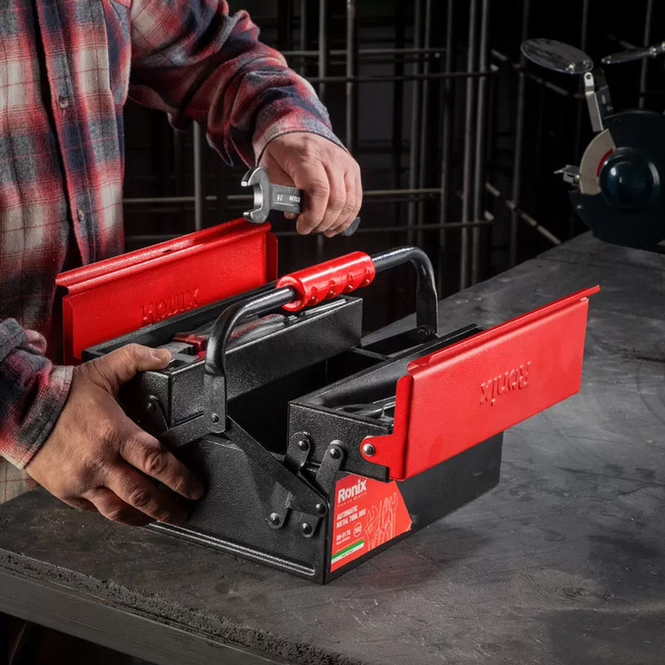 برای قرارگیری ابزارآلات به صورت منظم و مرتب، در خانه، کارگاه، کارخانه، مغازه، صندوق عقب خودرو و سایر اماکن و نیز برای جابجایی هر چه آسانتر ابزارآلات به محل کار، جعبه ابزارهای فلزی یک گزینهی خوب و بادوام و مطمئن به شمار میروند. برای اطمینان از دوام و استحکام این جعبه ابزار، تمام بدنهی آن از ورقههای فولادی مرغوب زنگنزن ساخته شده و به وسیلهی پینهای مقاوم و محکم به صورت ایستا و مقاوم، به یکدیگر متصل شده است. یک لایه رنگ کوره ای الکترواستاتیک بر روی تمامی بدنه زده شده است تا هم بر دوام و زیبایی آن اضافه کند و هم به سطح آن خاصیت ضد خش و خراش و زنگ زدگی بدهد. از این جعبه ابزار سایز 30 سانت، که دارای سه محفظه در دو اندازهی مختلف است، میتوانید برای نگهداری و جابجایی انواع ابزارهای کوچک و متوسط، از جمله انواع پیچ و مهره و واشر و آچار و انبر و انواع ابزار دستی مختلف استفاده نمایید. ابعاد 3 محفطهی این جعبه ابزار عبارتند از : دو محفظهی کوچکتر با ابعاد 5×10×30 سانتیمتر و یک محفظهی بزرگتر با ابعاد 10×20×30 سانتیمتر؛ در قسمت میانی دستهی فلزی این جعبه ابزار رونیکس، یک دستگیرهی پلاستیکی ABS ارگونومیک قرمز رنگ به طول 11.5 سانتیمتر قرار داده شده است که به خاطر جنس نرم و راحت خود و به دلیل داشتن جای انگشت گذاری، حمل و نقل جعبه را آسان و بدون خستگی کرده است. درب اصلی این جعبه ابزار اتوماتیک، به صورت خودکار است و به شکل کاملا منظم باز و بسته میشود.