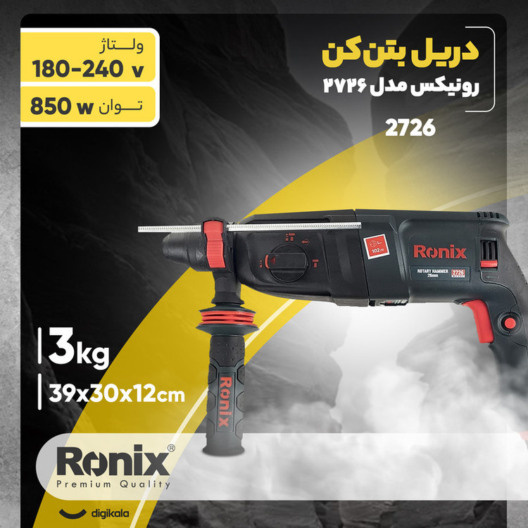 شرکت رونیکس (Ronix) با ارائه چندین مدل دریل، انتخاب یک دریل مناسب را برای مشتریان راحت کرده است. مدل 2726 با وزن 3 کیلوگرم و ابعاد 41 × 28 × 12 سانتیمتر ، یک دریل ضربهای با قدرت 850 وات است. سرعت این دریل در حالت بدون بار تا 1200 دور بر دقیقه میرسد و دارای قابلیت کنترل سرعت است. این دستگاه هم برای مصارف تجاری و هم برای استفاده در اماکن صنعتی مناسب است. این دریل توانایی سوراخکاری در چوب، فلز و بتون را دارد و حداکثر قطر سوراخ در این چوب، فلز و مصالح، به ترتیب 30، 13 و 26 میلیمتر است و برای تعویض مته نیازی به آچار ندارد. 2726 یک دریل بتنکن مناسب جهت کار در بسیاری از مشاغل صنعتی به شمار میآید. دریلهای برقی مختلفی در مدلها و طرحهای مختلف، توسط شرکتهای معتبر و جویای نام، تولید و به بازار عرضه شدهاند. مسلما این محصولات باهدف تأمین نظر مشتری و باقابلیتهای مختلف طراحی و تولید میشوند. خریدار با در نظر گرفتن مشخصاتی چون اندازه، قدرت و لوازم جانبی دستگاه در کنار شکل ظاهری و برند آن، اقدام به انتخاب و خرید دریل برقی موردنیاز خود میکند. در خصوص دریلهای چکشی و ضربهای که بیشتر برای امور صنعتی کاربرد دارند نیز به همین روال عمل میشود. بهخصوص کسانی که در مشاغلی چون آهنگری، کارگاههای ساختمانی و کار با بتون و مشتقات آن هستند، برای خرید دریل مورداستفاده خود، جدای از مشخصههایی که ذکر شد به دنبال دستگاهی کارآمد و پرتوان هستند که در کنار قدرت و سرعت مناسب، عمر طولانی داشته باشد. نکته مدنظر این افراد غالبا قدرت ضربه و عملکرد مناسب دستگاه در ساعات کار طولانی و پشت سر هم است. هرقدر دریل توانایی تحمل کار در این شرایط را داشته باشد، بیشتر موردتوجه کاربران و متقاضیان قرار میگیرد.