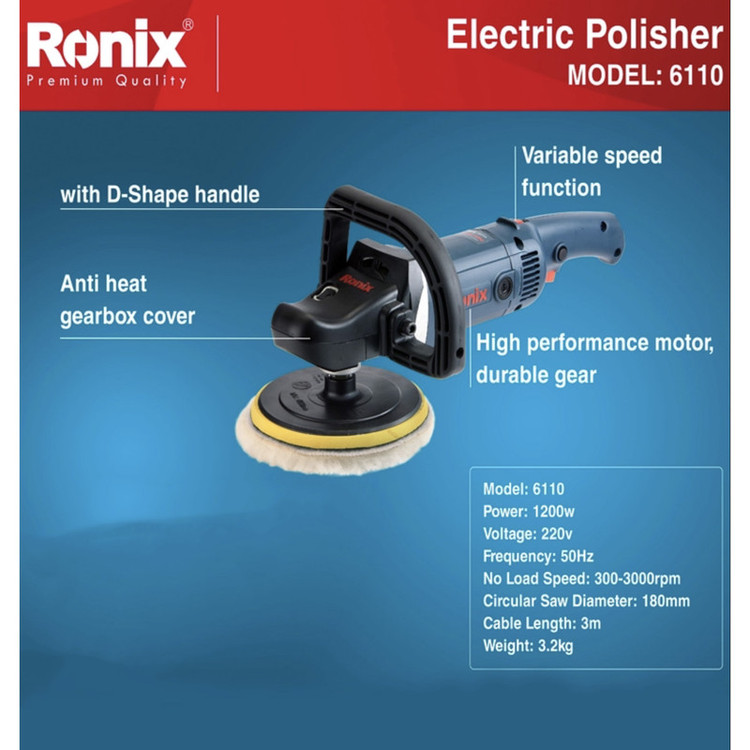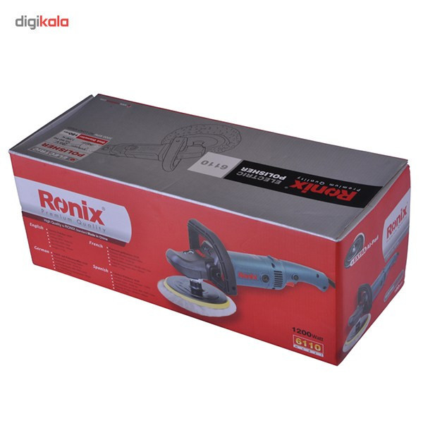 پس از تعمیر و رنگ سطوح فلزی، برای بهتر جلوه دادن این سطوح و براق کردن آنها از دستگاهی به نام پولیش استفاده میکنند. شرکت «رونیکس» (Ronix) یک مدل از این دستگاه را با نام 6110 تولید کرده است. این دستگاه با قدرت 1200 وات تولید میشود. این محصول دارای صفحهای از جنس آلومینیوم و با قطر 180 میلیمتر است. سرعت گردش این صفحه در حالت آزاد تا 3000 دور بر دقیقه میرسد. ویژگی این مدل در کنترل و تنظیم سرعت دستگاه است؛ یعنی علاوه بر مجهز بودن دستگاه به دیمر (کنترل سرعت با فشار بر روی کلید دستگاه)، قابلیت تنظیم سرعت در 6 حالت مختلف را دارد. برای استفاده از دستگاه پولیش، انتخاب صفحه یا در اصطلاح صفحه پوست مناسب اهمیت بسیار زیادی دارد. شرکت رونیکس در بستهبندی این محصول، یک صفحه قرار داده است. علاوه بر این، یک دفترچهی راهنمای فارسی، یک آچار آلن و یک دستهی کمکی همراه محصول ارسال میگردد. با توجه به قدرت و سرعت بالای این دستگاه، بهتر است قبل از استفاده از آن، مهارتهای لازم را کسب کنید تا دچار آسیب یا خسارت نشوید. در نظر داشته باشید که استفاده از دستگاههایی مانند پولیش و فرز به همراه دستهی کمکی بسیار ایمنتر و راحتتر خواهد بود.