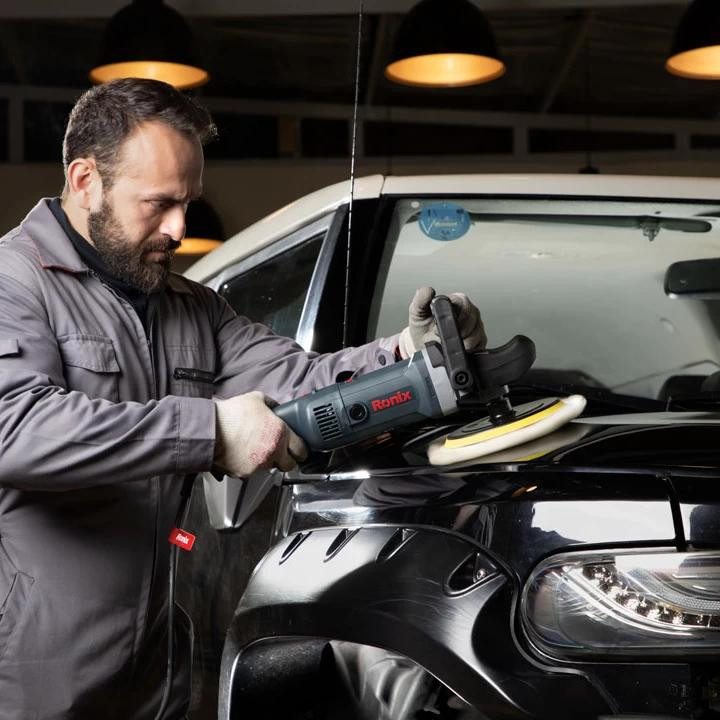 پس از تعمیر و رنگ سطوح فلزی، برای بهتر جلوه دادن این سطوح و براق کردن آنها از دستگاهی به نام پولیش استفاده میکنند. شرکت «رونیکس» (Ronix) یک مدل از این دستگاه را با نام 6110 تولید کرده است. این دستگاه با قدرت 1200 وات تولید میشود. این محصول دارای صفحهای از جنس آلومینیوم و با قطر 180 میلیمتر است. سرعت گردش این صفحه در حالت آزاد تا 3000 دور بر دقیقه میرسد. ویژگی این مدل در کنترل و تنظیم سرعت دستگاه است؛ یعنی علاوه بر مجهز بودن دستگاه به دیمر (کنترل سرعت با فشار بر روی کلید دستگاه)، قابلیت تنظیم سرعت در 6 حالت مختلف را دارد. برای استفاده از دستگاه پولیش، انتخاب صفحه یا در اصطلاح صفحه پوست مناسب اهمیت بسیار زیادی دارد. شرکت رونیکس در بستهبندی این محصول، یک صفحه قرار داده است. علاوه بر این، یک دفترچهی راهنمای فارسی، یک آچار آلن و یک دستهی کمکی همراه محصول ارسال میگردد. با توجه به قدرت و سرعت بالای این دستگاه، بهتر است قبل از استفاده از آن، مهارتهای لازم را کسب کنید تا دچار آسیب یا خسارت نشوید. در نظر داشته باشید که استفاده از دستگاههایی مانند پولیش و فرز به همراه دستهی کمکی بسیار ایمنتر و راحتتر خواهد بود.