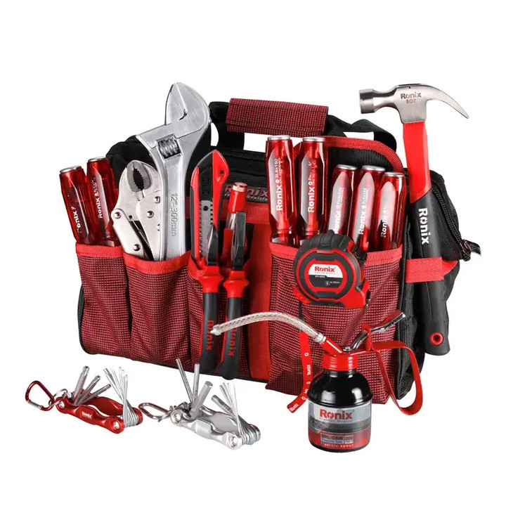 اگر قصد تهیهی مجموعه ابزاری ساده و کارآمد دارید محصول فوق پاسخگوی نیازهای شما خواهد بود. این مجموعه 19 عددی از ضروریترین ابزارهای کار برخوردار است. شرکت «رونیکس» (Ronix) برای این مجموعه 3 پیچ گوشتی دوسو و 4 پیچ گوشتی چهارسو با سری آهنربایی و قابلیت کوبش پذیری درنظر گرفته است تا بتوانید بسیاری از پیچهای دوسو و چهارسو را باز و بسته کنید. برای پیچهای دیگر نیز 8 پیچ گوشتی ستارهای و 8 آچار آلن طراحی شده است. فازمتر این مجموعه طولی 18 سانتیمتری دارد و دامنه ولتاژ آن 500-100 ولت است. انبرهای این مجموعه نیز شامل سیمچین، انبردست و انبر قفلی میشوند که به ترتیب طولی برابر 16.5، 19.5 و 23 سانتیمتر دارند. از دیگر ابزارهای کاربردی که برای هر کیف ابزاری ضروری است کاتر، آچار فرانسه، متر و چکش را میتوان نام برد. شرکت رونیکس نیز به این موضوع توجه داشته است. آچار فرانسه این مجموعه 10 اینچی بوده و چکش و کاتر آن بهترتیب طولی برابر 28 و 17 سانتیمتر دارند. طول نوار متر فلزی آن نیز 5 متر بوده و از قفل، استپر و سری آهنربایی برخوردار است. برای روغنکاری قطعات نیز روغندانی فلزی با ظرفیت 200 میلیلیتر عرضه شده است. این مجموعه درون کیف ابزاری برزنتی با 35 محفظه قرار دارد که از بند و فریم فلزی دور دهانه سود میبرد.