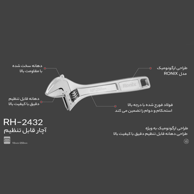 درجه بندی شده بر اساس میلی متر، حداکثر میزان باز شدن دهانه 20 میلی متر فک قابل تنظیم جهت شل یا سفت کردن انواع پیچ و مهره ها، مقاوم در برابر خوردگی با طول 20 سانتی متر (8 اینچ)، ساخته شده از استیل فورج شده