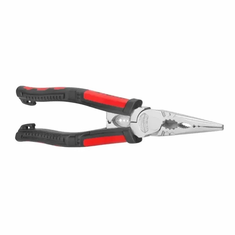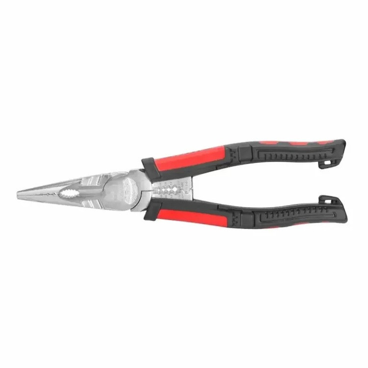 دم باریک الکترونیک 8 اینچی چندکاره RH-1393 رونیکس، یک ابزار کارآمد چندمنظوره برای ثابت نگهداشتن، گرفتن، خمکردن و برش سیمهای نرم و سخت است. بدنه: دسته ارگونومیک و خوشدست با روکش دو رنگ از جنس TPR جهت انتقال بهتر نیرو به قطعه کار؛ طراحی جدید با نیروی اهرم بالاتر جهت افزایش 50 درصدی نیروی برشی؛ مجهز به قسمت نگهدارنده میخ و سیم؛ قابلیت استفاده بهعنوان آچار رینگی فک: دارای فکهای بلند دندانهدار؛ لبههای برشی بسیار تیز از جنس فولاد کروم-وانادیوم فورج جهت ایجاد برشهای سریع و موثر؛ تیغههای سختکاریشده و حرارتدیده با درجه سختی HRC 62 برای دوام در عملکرد یک ابزار کارآمد چند منظوره برای لخت کردن سیمها تا قطر 2.0 میلیمتر، برش کابل و سیم تا قطر 2.6 میلیمتر و پرس کردن سر سیمها تا سطح مقطع 6 میلیمتر مربع مجهز به قسمت نگهدارنده میخ و سیم دارای فکهای بلند دندانهدار قابل استفاده بهعنوان آچار رینگی می باشد.