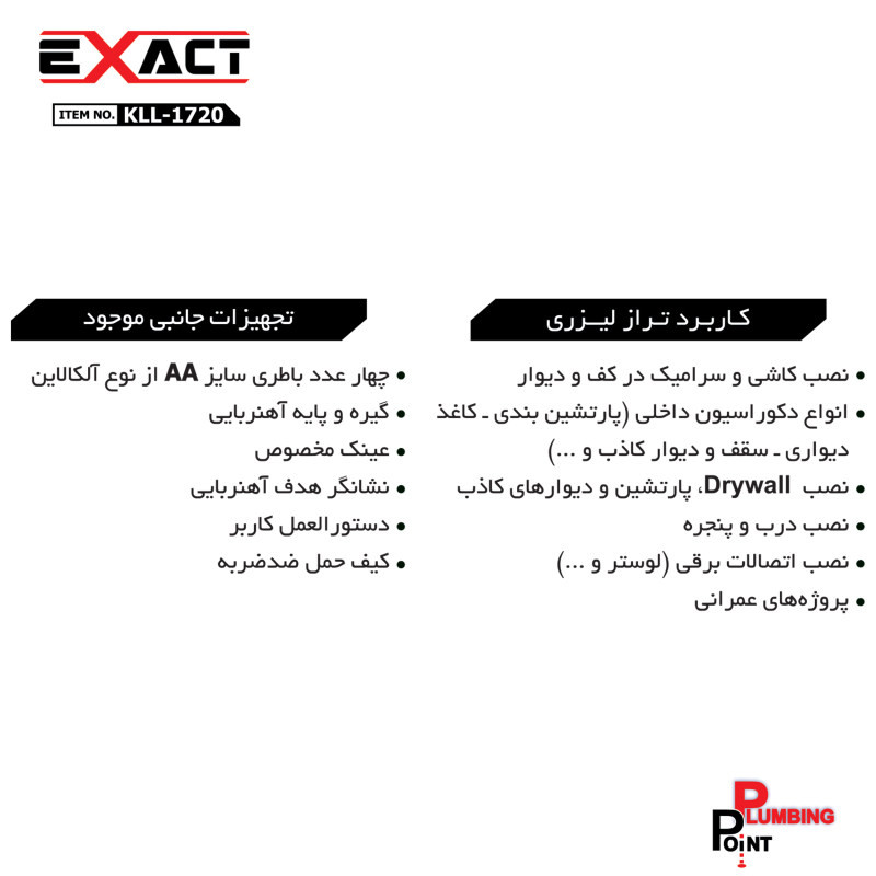 باتری , دارای سیستم تراز خودکار , قابلیت خاموش شدن خودکار , قابلیت نصب روی پایه , قابلیت نمایش خط , قفل تراز , نمایش خط لیزر افقی , نمایش خط لیزر عمودی